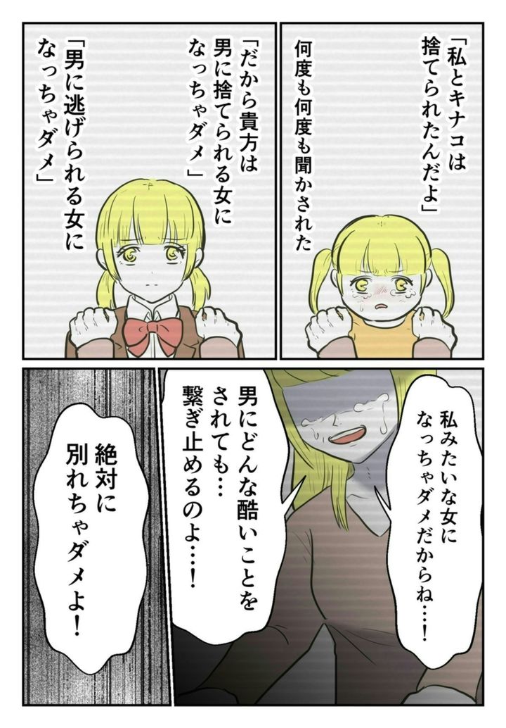 キナコは、幼いころから父が母に暴力をふるうところを何度も見て育ちました。さらに、父が出て行ったあと、母には「男に酷いことをされても絶対に別れちゃダメ」と繰り返し言われてきたのです。まさに、母の言葉が呪いのようになり、キナコを縛りつけていたのです…。