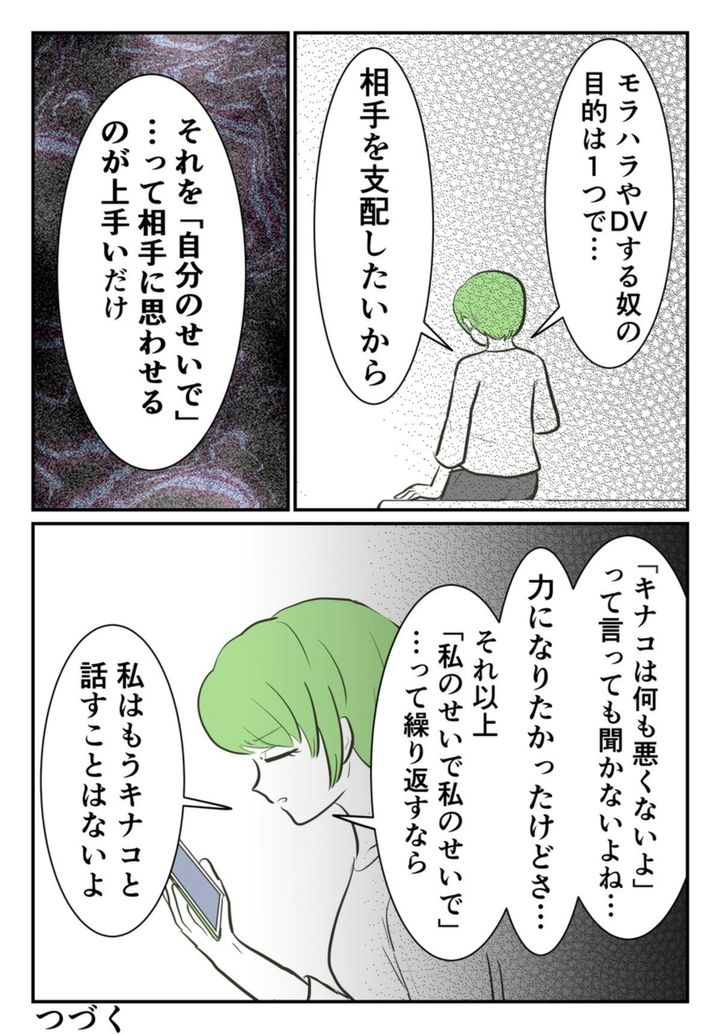 ですがこのあと、モラ介の実姉がDVに気づきます。異常な状態に気づいたモラ介の姉は、キナコを救い出してくれたのです。また、キナコ自身もモラ介への気持ちが冷め、きっぱりと別れを決意することができました。一度は見限られかけた友人との関係ももとに戻ったといいます。