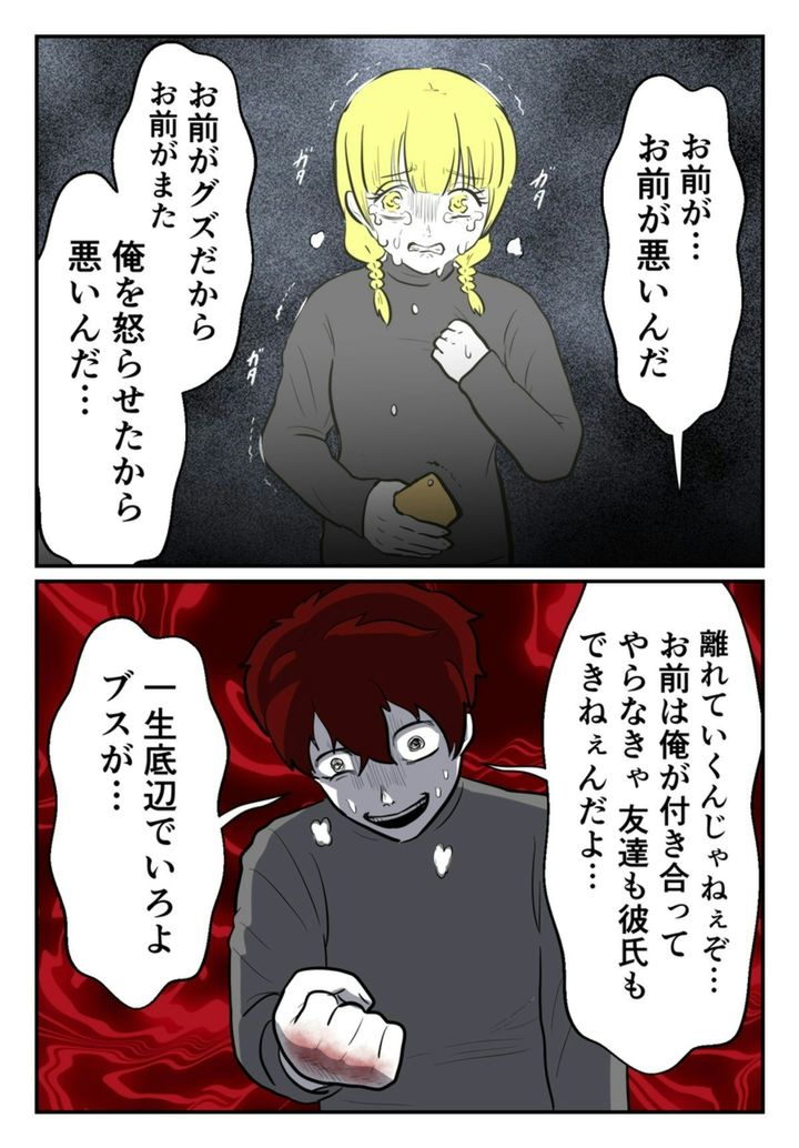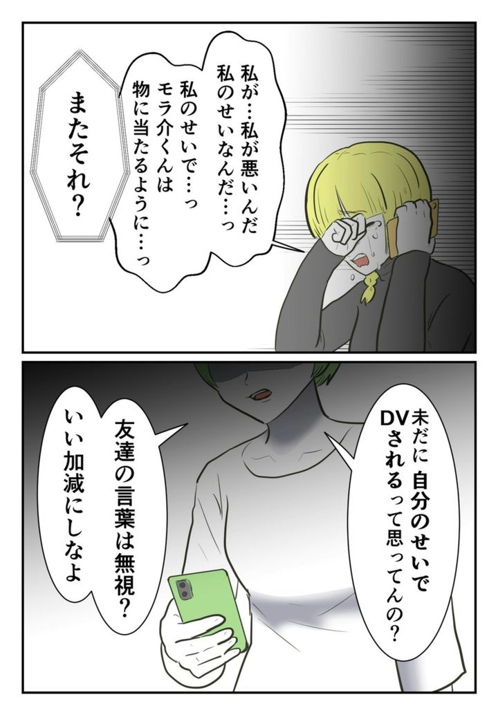 モラ介からのDVを受けて助けを求めようと、キナコは友人に電話をかけます。ですが友人は、何度も別れるようアドバイスしてもかたくなにDV彼氏と別れないキナコを見限ろうとしています…。誰よりもキナコを心配し、寄り添い、必死に説得を続けてくれた友人を、キナコは失ってしまいそうな状況です。