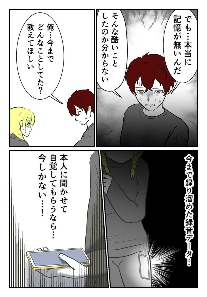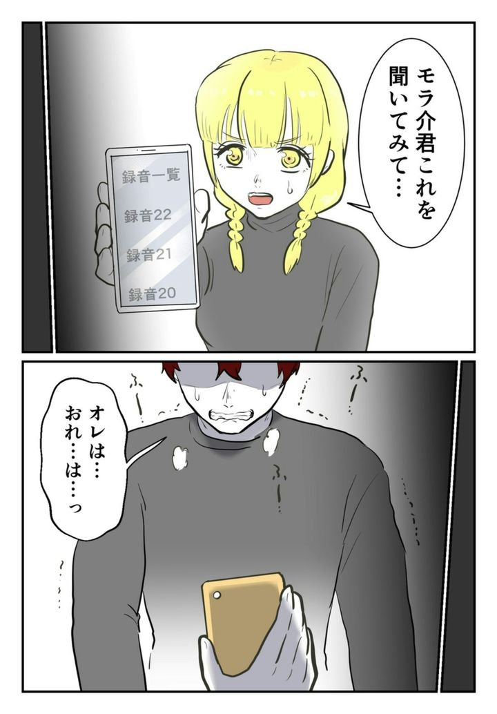 そして、モラ介が爆発するサイクルを見極め、機嫌がいいタイミングで「物に当たらないで欲しい」ことを伝えます。今まで、モラ介がDVをするたびに、キナコは録音を続けていました。そして、絶好の機会だと思い、モラ介に録音データを聞かせます。