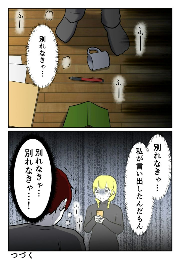 ところが、録音データを聞いた途端、モラ介はいつものDV行為をしはじめました。モラ介が行動を改めてくれないことを悟ったキナコは「別れなきゃ」と思います。