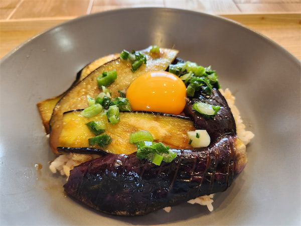 【ナスだけで最強丼】「なすの1本丼」の味の要は濃厚だれ♪とろとろ果肉に味染み染みで卵黄がとどめ!