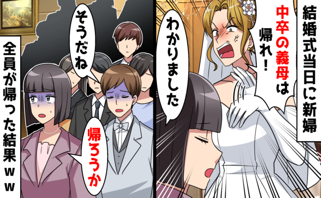 おまけに、「この私の結婚式に低学歴が参列? 恥ずかしい。中卒の義母は帰って! 叔父さんや叔母さんもよ、どうせあんたらも中卒なんでしょ!」とわめいたのです。