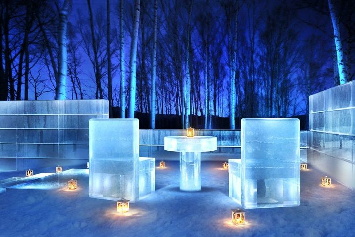さらに2025年はライトアップした白樺を目の前に、ランタンの暖かい光のなかで長い夜の時間を楽しむことができる「氷のテラス」が初登場。テラスには氷で造られた椅子と机が設置されていて、ホットワインなどを片手に特別なひとときを過ごせる。静寂な空間のなか、白樺の木々や景色、星空を眺めながら氷の世界を心ゆくまで楽しみたい。