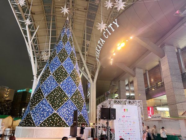 スタート当日には点灯式が行われたので、その様子をお伝えしたいと思います!天気はあいにくの雨でしたが、JR博多駅前広場には大屋根があって濡れにくいため、たくさんのお客さんで賑わっていました。