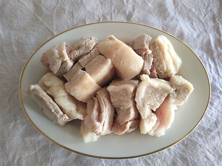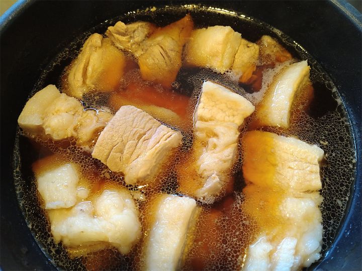 4.茹でた豚肉は湯を切って3~5cm幅に切る。鍋に豚肉と[A]を加え、沸騰したら弱火にし、フタをして約30分煮る。