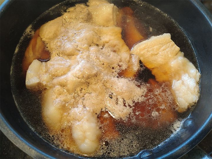 沸騰してきたらアクを取り、弱火にして約1時間茹でます。