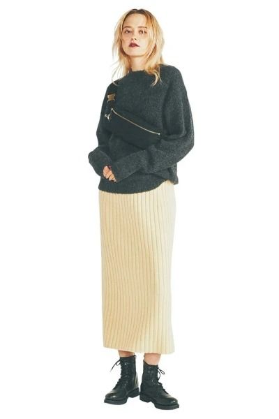 シンプルなニットの上下。ボトムだけリブを太くすることで縦線を強調しながらメリハリづけも獲得。ブーツのなかでも引き締め力の高い黒のレースアップブーツで、やわらかいムードにシャープさを加味。