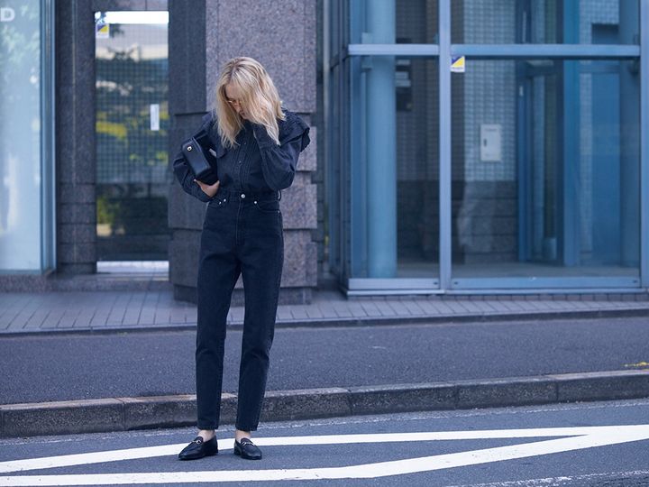 フリルをまとったブラウスでメンズライクがレディに好転。デニム素材によるハリ感が、フリルの立体感をより強調。上下黒のIラインでまとめたことで、上下デニムでもシックな方向に。