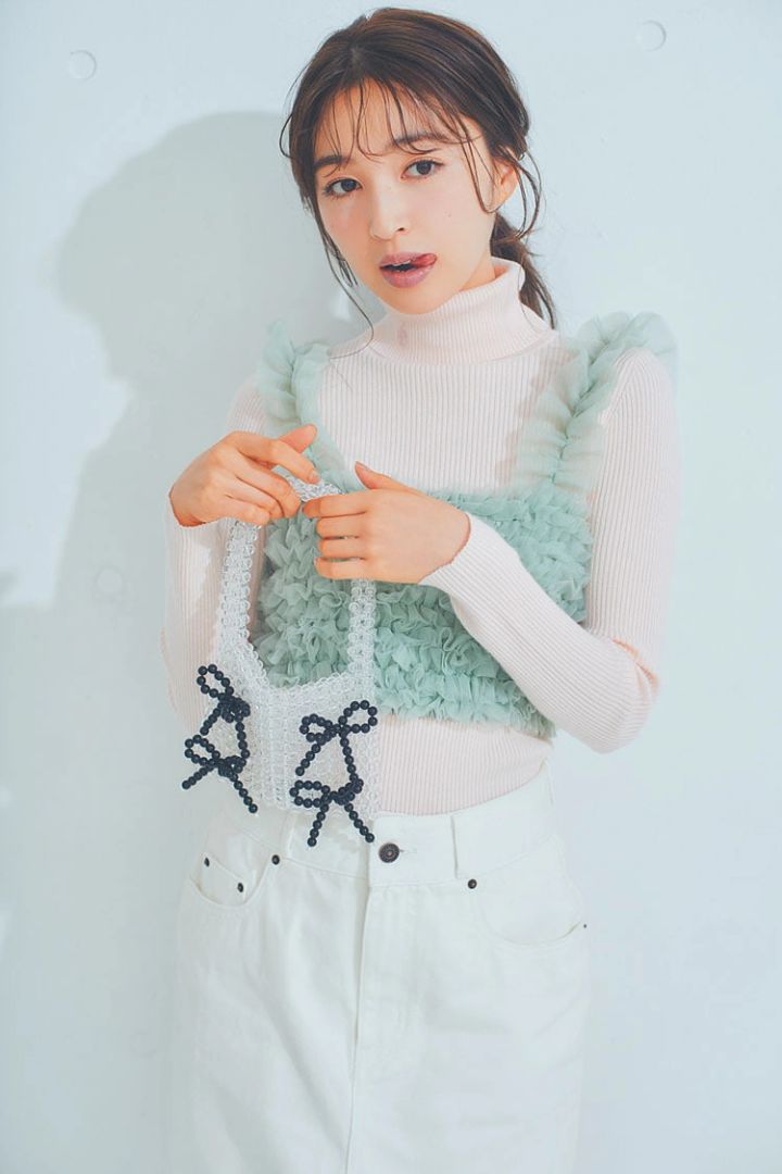 ピンクタートルニット 7,980円/épine チュールビスチエ 7,880円/Treat Ürself 白デニム台形スカート 2,199円/WEGO ビーズバッグ 1,699円/GRL