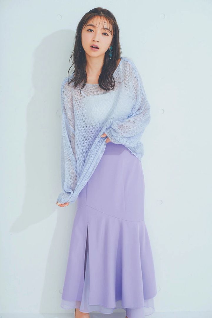 タイトすぎないマーメイドスカートはウェーブさんでもはきやすい。透け感のあるニットを選べば重たい印象を回避できる♡