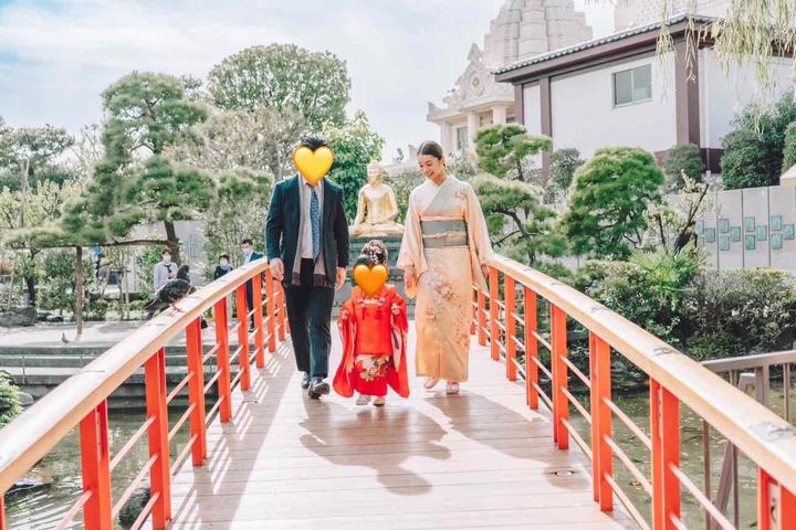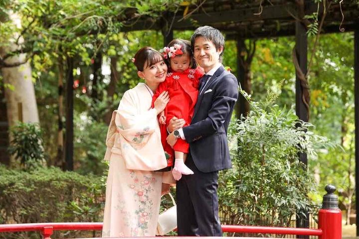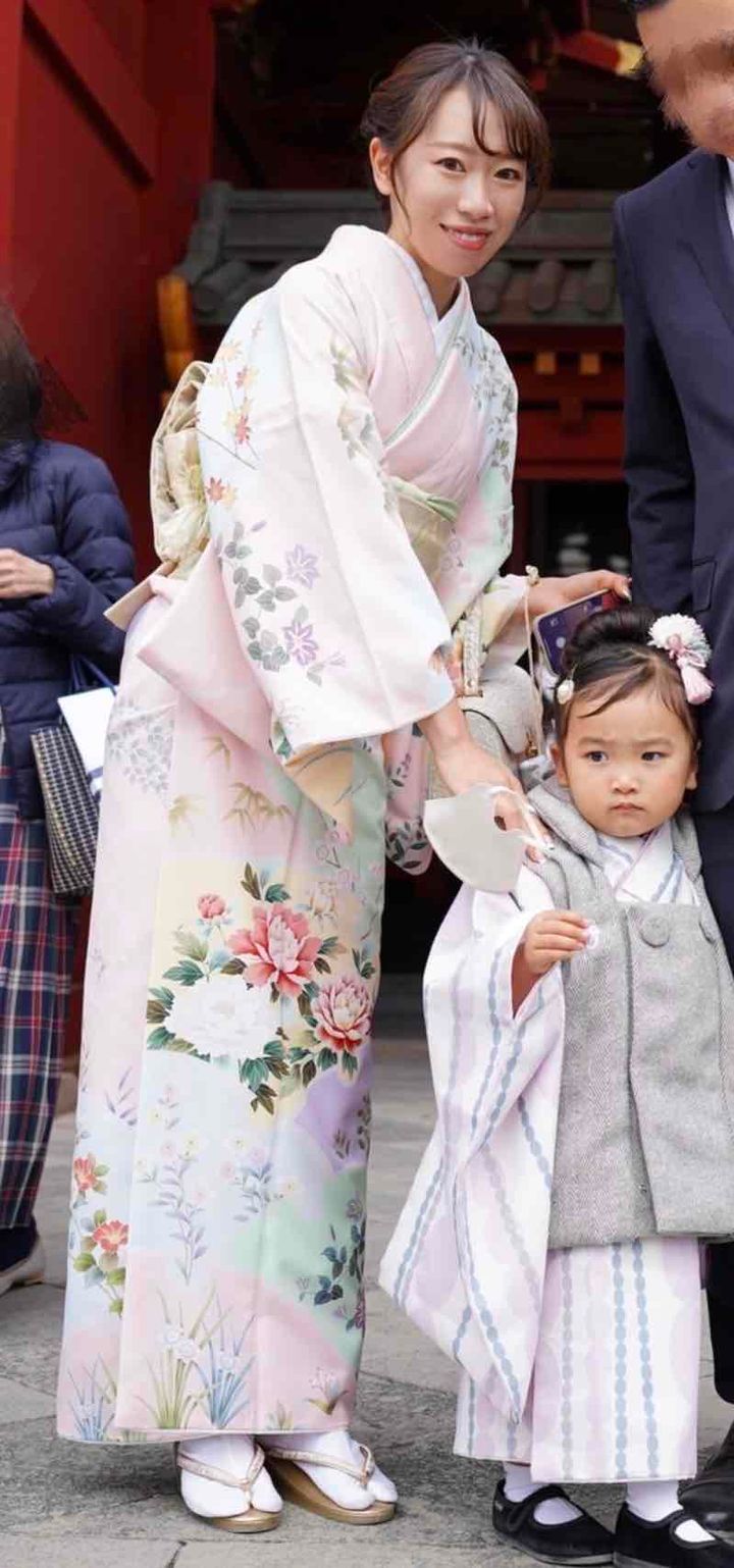 「私の着物は母から、帯は着物に合うものを探していたときに友人が貸してくれました。娘の着物は私が七五三のときに着たものを受け継ぎ、小物類は伊勢丹で新調。朝、スタジオアリスで着付けと撮影後、川崎大師に移動してネットで探したフリーのカメラマンさん来てもらって出張撮影も行いました。3人だけでの実施で食事はせず帰宅したのもあり、疲れすぎず済んでよかったです」新倉麻実さん・主婦/157㎝・30歳(4歳の女の子ママ)