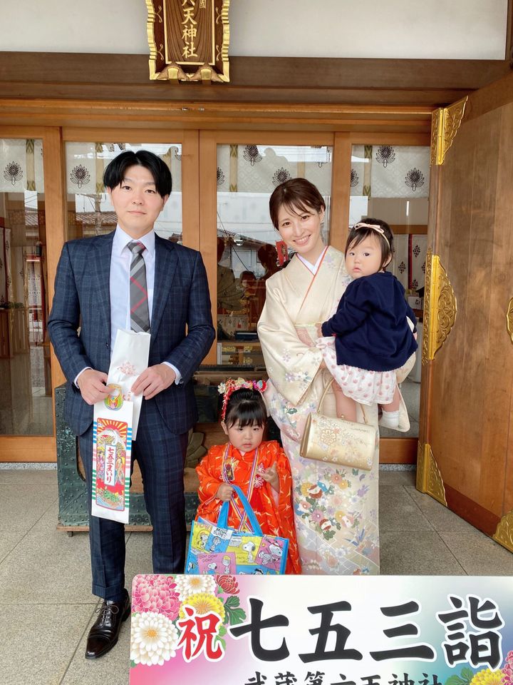 「昔からお世話になっている写真館で撮影することを決めていた今回、私は好みの着物をネットで探して持ち込みました。着付けは『暮らしのマーケット』で見つけた方に自宅に来てもらい、ヘアセットはYouTubeで見つけた簡単なアレンジを何度も練習し、セルフで行いました。次女が1歳になったばかりでまだ授乳期だったため、美容院に行かず時短で済んだのでよかったです。娘の着物は写真館でレンタルし、着付けとヘアセットもそこでお願いしました。撮影してから武蔵第六天神社へ行き参拝。とにかく当日は時間との勝負でバタバタだったので、後日改めて『木曽路』で食事会をセッティングしました」野口晶子さん・37歳/主婦・161㎝(5歳と3歳の女の子ママ)