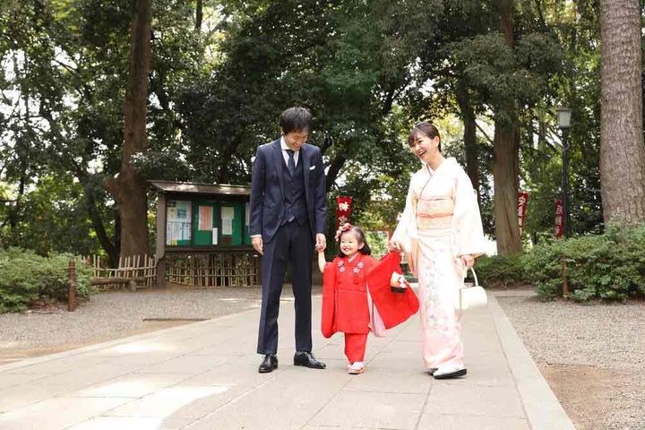 「着物を着るのが初めてだったので一式借りられるネットショップで探し、着付けとヘアセットを美容院でお任せしました。きっちりまとめると老けて見える気がしたので、普段の雰囲気のまま顔まわりや前髪をふんわり巻いてもらうようにオーダーしました。当日は娘が慣れない着物で疲れないよう、すべて午前中で終わるように設定。祈祷はしてもらいましたが撮影は自分たちで行いました。12月が誕生日のため、11月に実施したときはまだ3歳手前。鶴岡八幡宮に参拝しましたが砂利道での草履は歩きづらいと思い、普段から履いていて着物にも合いそうな『Cienta』のベロアシューズを着用させました」飯島ゆいさん・27歳/主婦・158㎝(4歳の女の子ママ)