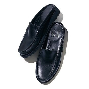 黒ミュールローファー(2.5)/パラブーツ × ビームス ボーイ(ビームス ボーイ 原宿) 適度な重みと深めの甲により、かかとなしでも高いホールド力。プレーンなアッパーとは対照的なシャークソールがこだわりを感じさせる。