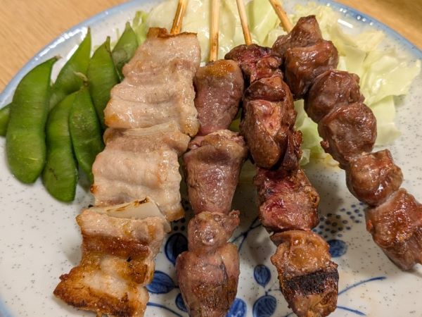 お通しのキャベツと枝豆と共に、4種のやきとりが目の前にやってきました!