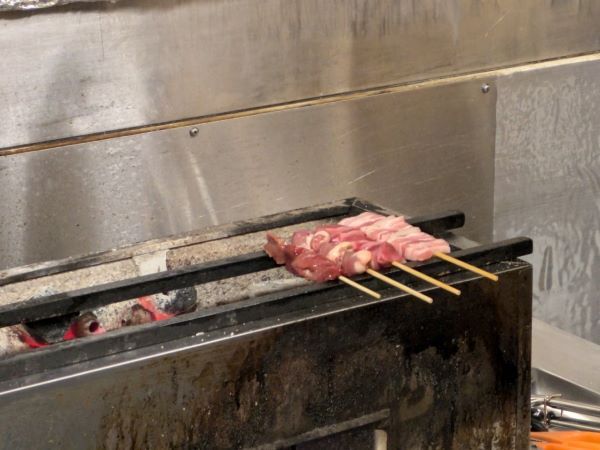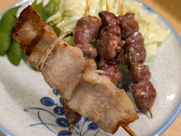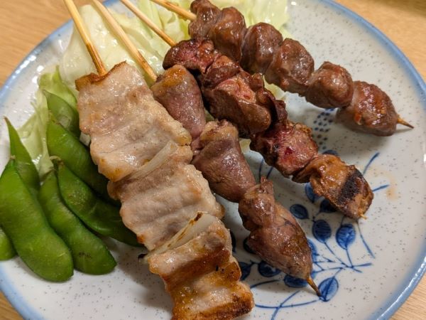 福岡ですから、県外出身の私も「郷に入っては・・・」ということで「豚バラ」はマストです。あとは大好きな「砂ズリ」「丸ハツ(心臓) 塩」「肝(レバー) 塩」をオーダーしました。この4種は全て150円ですから、お財布に優しい価格帯ですよね。ワンドリンク制ではありませんが、お席代+お通代は150円です。