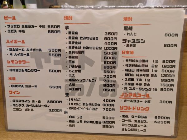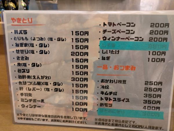 やきとりのメニューはこちらです。種類が多いですね。そして、パッと見た感じ、リーズナブルな価格です。