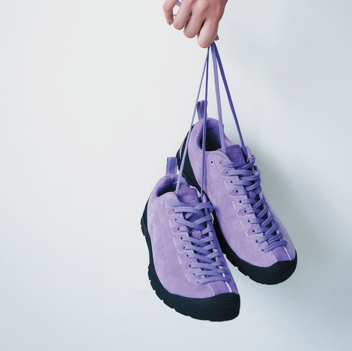 可愛すぎる深みラベンダーのスニーカーは秋らしいスエード素材。グレーなどモノトーンコーデに合わせて足元を主役に。