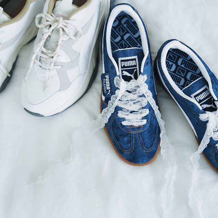 〈右〉スニーカー¥13,750/プーマ(アトモス ピンク フラッグシップ 原宿店) 〈左〉スニーカー¥14,300/エミ×プーマ(エミ ニュウマン新宿店)