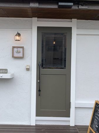オシャレな洋菓子屋さんでドアもナチュラル系のグリーンでオシャレな陶器が窓から少し見えます。