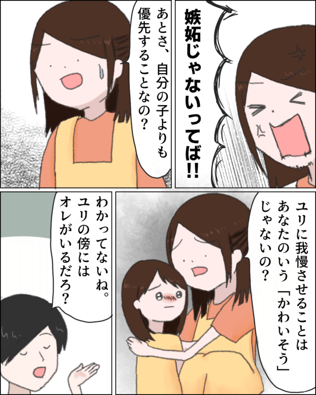 「嫉妬じゃないってば!!」どうしてそんな考えになるんだか。私はまだしょんぼりしているユリを抱きしめて、「自分の子よりも優先することなの?ユリに我慢させることはあなたの言う『かわいそう』じゃないの?」と夫を責めました。夫は呆れたように「分かってないね。ユリの傍にはオレがいるだろ?」と言う夫ですが、娘を置いてよその子とファミレスに行こうとしている夫の言葉は説得力がありませんでした。
