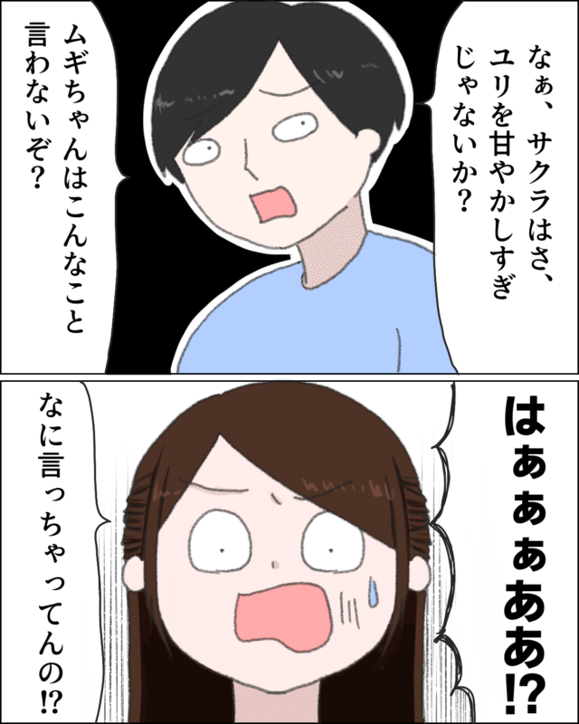 ムギちゃんとファミレスでご飯を食べるなら一緒に行きたいと駄々をこねたユリを見て「サクラはさ、ユリを甘やかしすぎじゃないか?ムギちゃんはこんなこと言わないぞ?」という夫に「はぁあああ!?なに言っちゃってんの!?」と憤慨しました。
