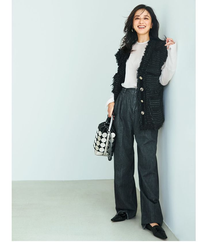 まさにトラウザー感覚。きちんとシーンでも穿ける2タックデザイン。ツイードベスト&透けブラウスの甘さを40代のリアルに落とし込むハンサムシルエットをチョイス。