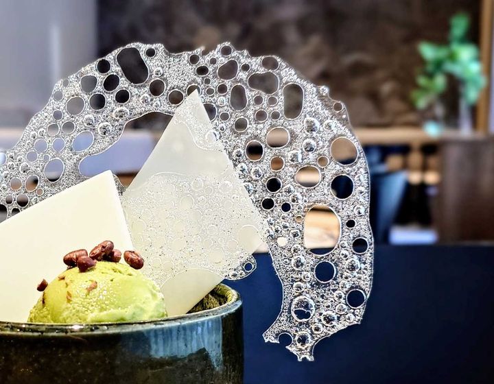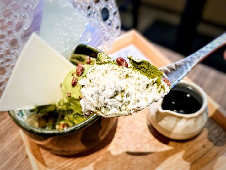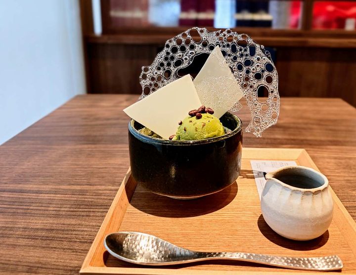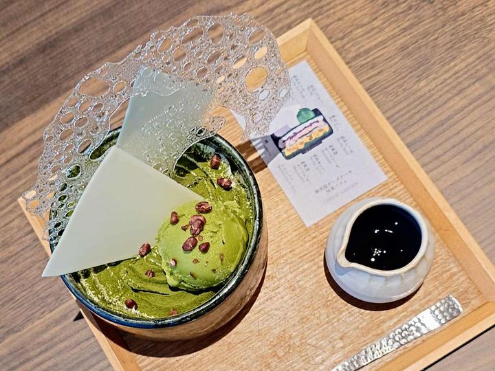 抹茶アイスの下にはホイップクリームが敷かれているほか、ふりかけられた抹茶は緑深い自然の景色のよう。一見しただけでは構造があまり見えないので、どこでどんな味わいと出会えるかな?という楽しみも!