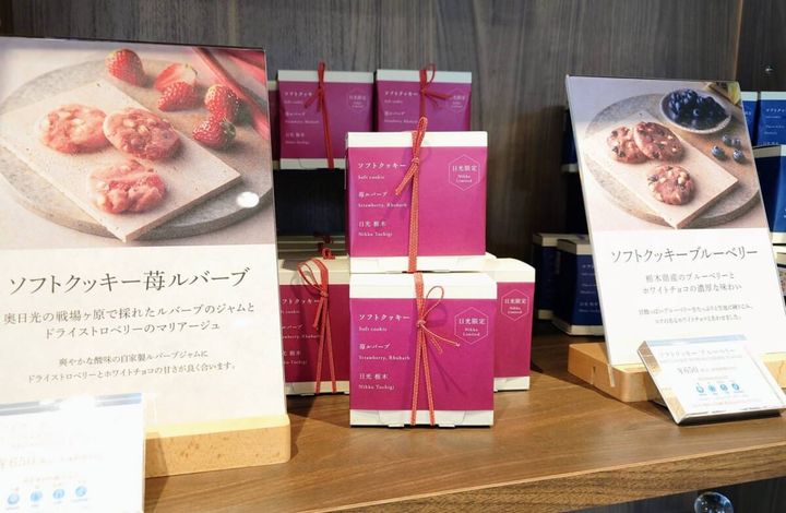 ホワイトチョコレートと栃木の果物を合わせたTHE NIKKO限定「ソフトクッキー」(各税込650円)。自家製ルバーブジャムとドライストロベリーが甘酸っぱい「苺ルバーブ」、県産ブルーベリーを使った「ブルーベリー」、県産宮柚子が爽やかな「柚子」の3種類。なんと「ルバーブ」は奥日光の戦場ヶ原で門林さんが育てているそう!