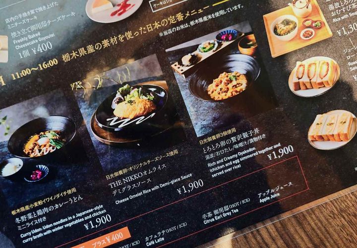 ランチタイム(11時〜16時)には、栃木県産小麦粉イワイノダイチで作った麺を使ったカレーうどん、日光御養卵を3個も使った親子丼、定番のオムライスも登場。栃木県産の素材を使ったボリューミ―な内容です(各税込1,900円)。