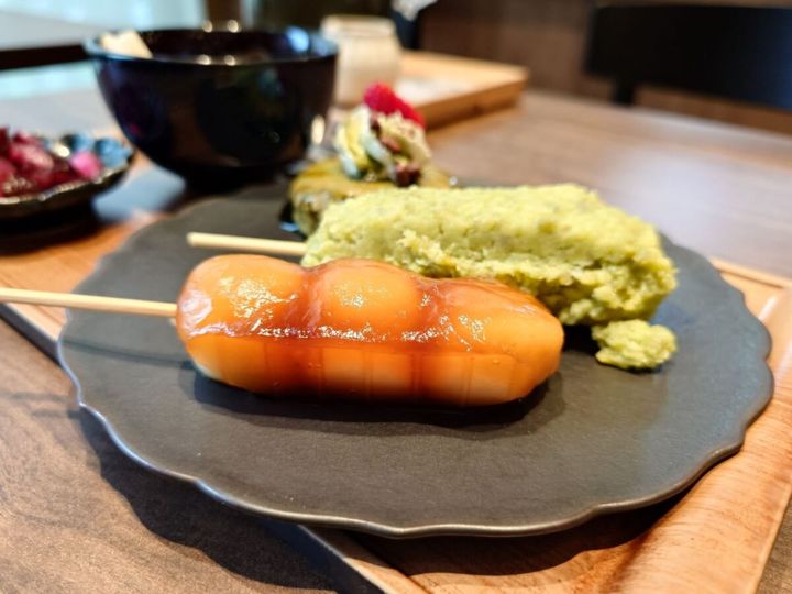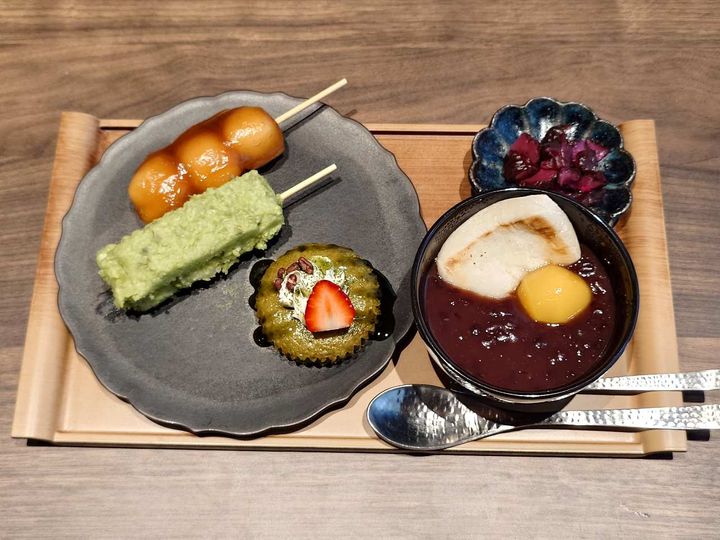 冬季限定「栗ぜんざいと和スイーツのプレート」(税込1,500円)。串団子2本、抹茶パンケーキ、栗ぜんざい、箸休めのしば漬けのセット。意外と外国人観光客にはお餅が人気とのこと。