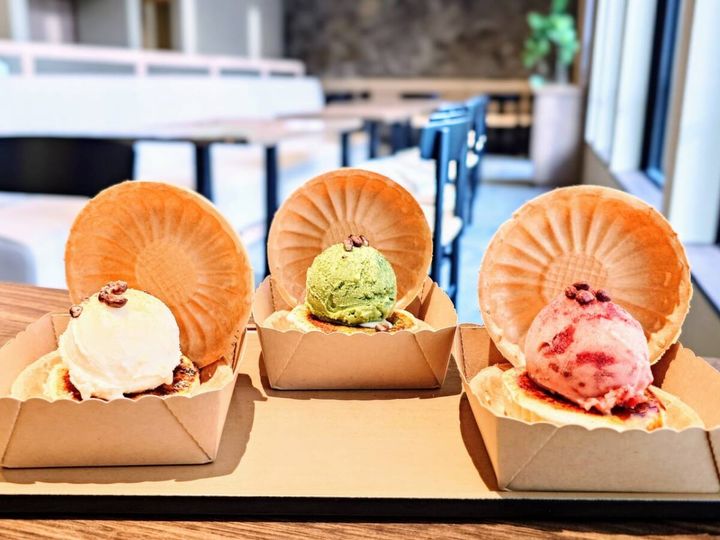 3つ目は先ほどの「御用邸チーズケーキブリュレ」の上に、アイスをのせた「アイスのせ(マスカルポーネ・抹茶・ストロベリー)」(各税込650円)。ハンバーガーのように最中で挟んだり、スプーン代わりに最中でアイスをすくったり。乾燥小豆がトッピングされていて、見た目も食べ方もポップ!