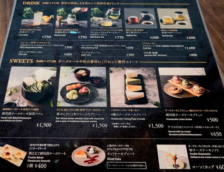 店舗限定の「和パフェ」や期間限定の「和スイーツプレート」、「チーズケーキ」などスイーツ系(税込400円〜)のほか、日光オリジナルブレンドコーヒー、お客さんが自分で点てる抹茶ラテ、オリジナルブレンドティー「手茶 御用邸」、栃木県宇都宮産の宮柚子を使った「宮柚子ソーダ」といったドリンクもあります(税込480円)。