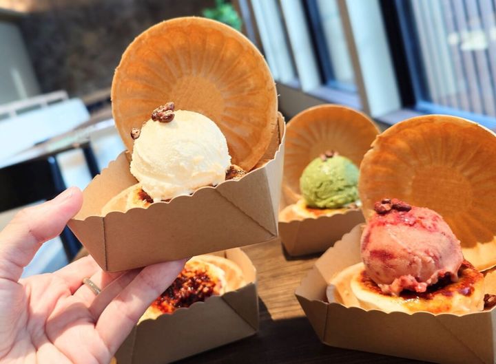 最中のお皿にのっているので食べ歩きにもバッチリ。パキっと割れたブリュレの間からはクリームがあふれ、甘くて香ばしいブリュレ部分と、濃厚なのに優しい味わいのチーズケーキを楽しめます。