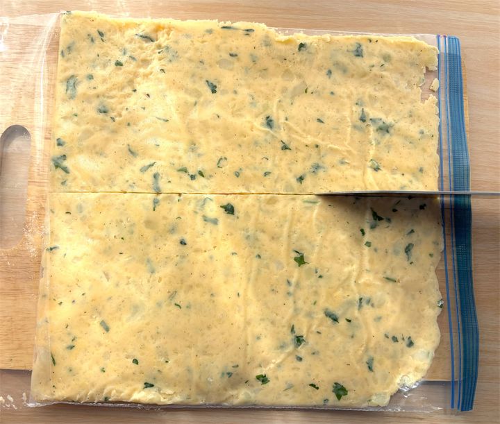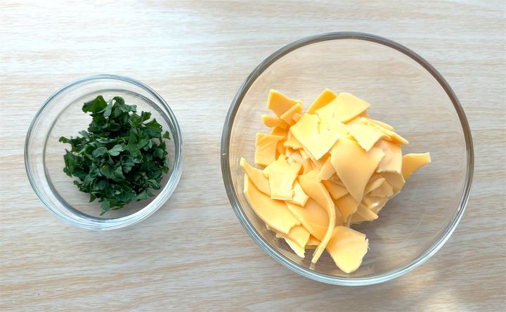 パセリは茎を取ってみじん切りに、チーズは混ざりやすいように小さく切っておきます。