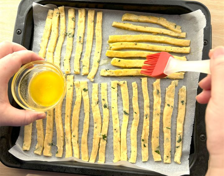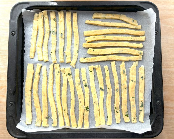 切った生地は、オーブンペーパーを広げた天板の上に並べます。