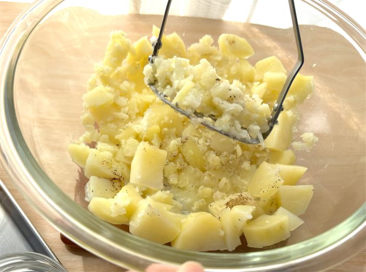 1のじゃがいもの加熱が完了したら、熱いうちに塩とこしょうを加えて、じゃがいもを潰します。