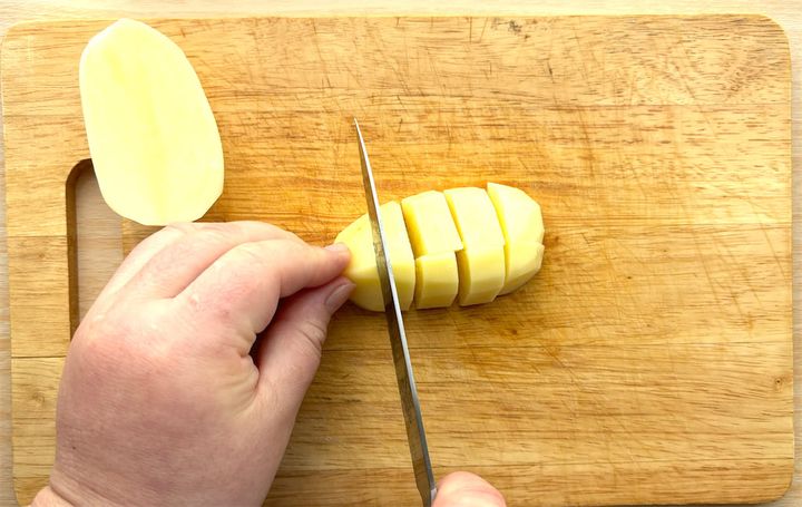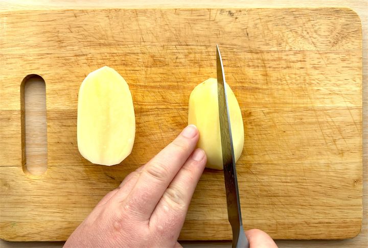 じゃがいもは皮を剥いて、火が通りやすい大きさに切ります。 わたしは半分に切って、それを再び縦半分ずつに切り、
