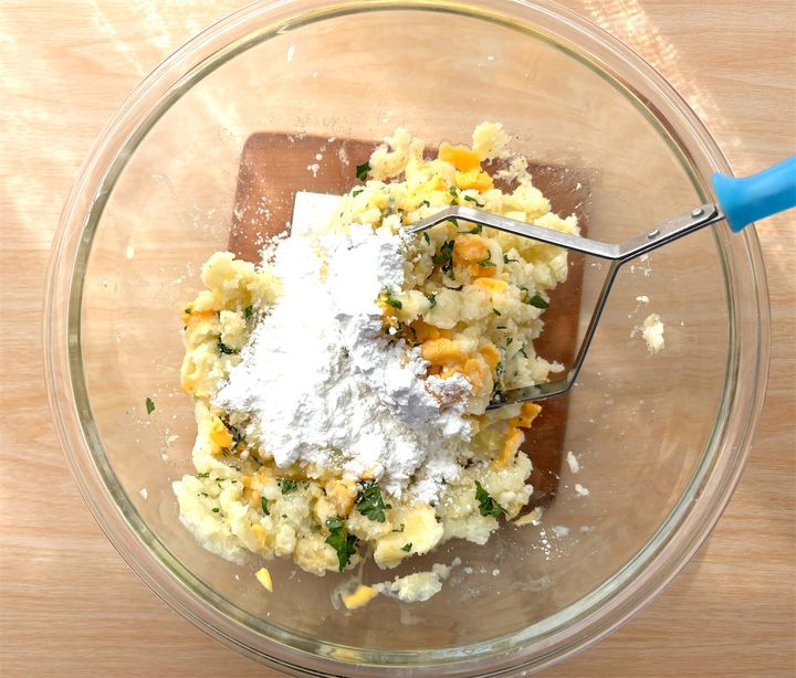 だいたい潰れたら、2のパセリとチーズ、そしてコーンスターチを加えて、さらによく混ぜていきます。