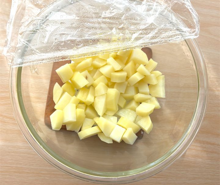切ったじゃがいもを耐熱ボウルに入れたら、水を加えて電子レンジ500Wで5~7分加熱します。