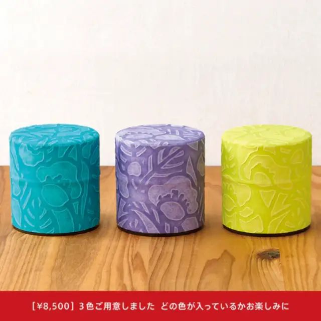 越前和紙を使用した茶缶。越前和紙は、正倉院に貯蔵された古文書でも確認できるほど、古くから作られている和紙です。お茶の花をあしらったデザインが、わずかに凹凸を持って精緻に表現されていますよ。色は、インテリアに馴染みの良い「藤色」、きっぱり鮮やかな「翡翠色」、明るい雰囲気の「若葉色」の3種類がラインアップ。