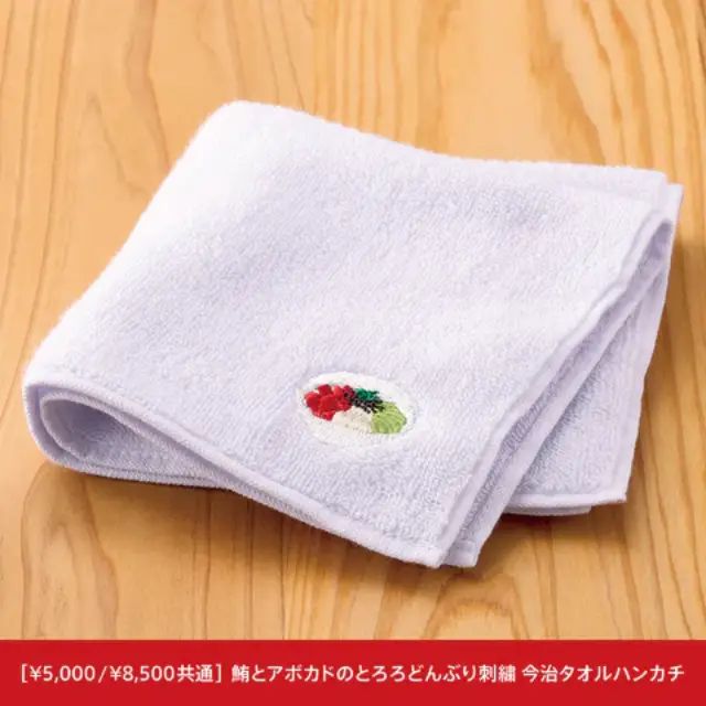 手触りのよい「今治タオル」に、nana's green tea人気メニュー「鮪とアボカドのとろろどんぶり」を刺繍したハンカチです。福袋商品として、今治タオルハンカチも4年目を迎え、シリーズ化したデザインが人気を呼んでいるのだとか。
