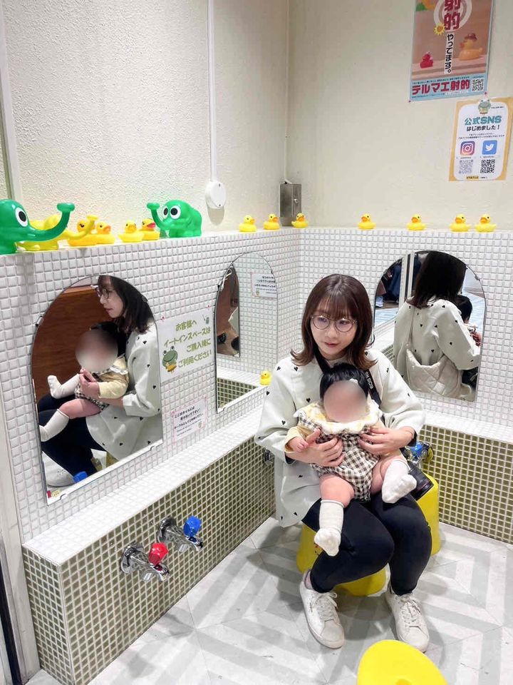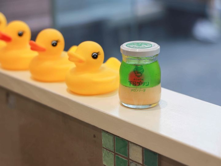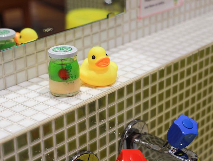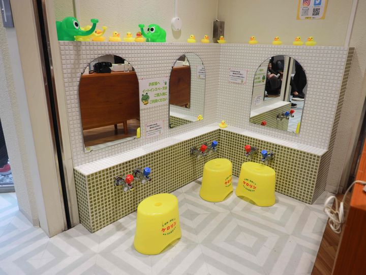 下呂プリンのイートインスペースは、銭湯のようなレトロな空間。ケロリンの椅子やアヒルさんの黄色が効いていて、写真映えします。
