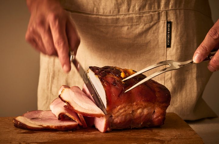 ふくどめ小牧場で大切に育てられた幸福豚のもも肉に、スパイスやハーブ、ママレードなどを合わせたグレーズをまとわせて焼き上げた極上ハム。しっとりと柔らかいのでスライスして前菜にしたり、パンにのせたりすると相性抜群。とにかく美味しいので、ぜひ切り立てでフレッシュ感や香りのよさ、口溶けを楽しんで。