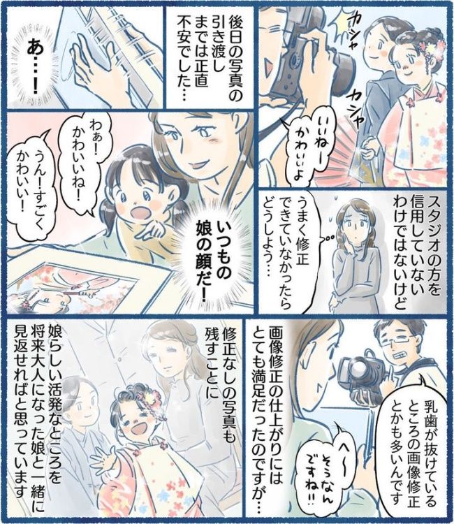 そして1週間後。引渡し時に写真を確認したところ、きれいに傷が隠れており、いつもの娘の顔でホッとしました! 店員さんによると、乳歯が抜けているところを画像で修正するお子さんも多いとのことです。