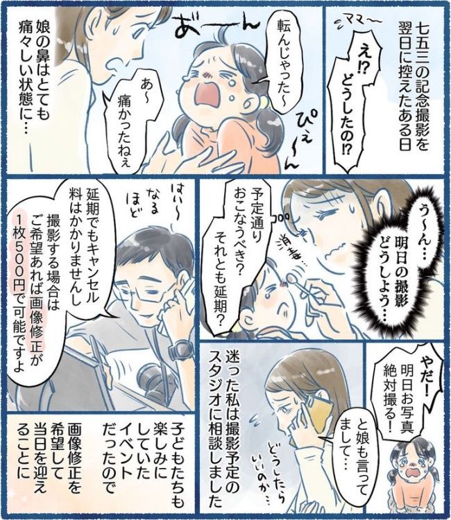 「キャー!」七五三の撮影前日に鼻を擦りむいた娘。写真屋さんに相談した結果、わが家の出した結論は