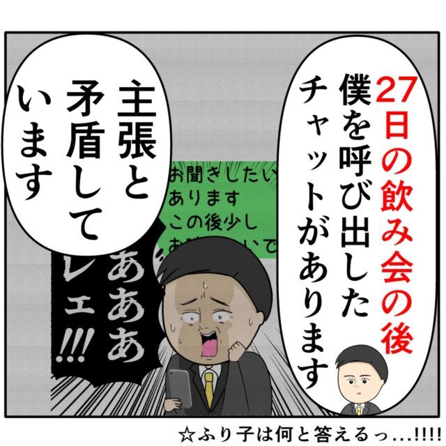 良し男さんは「27日の飲み会の後、僕を呼び出したチャットがあります。主張と矛盾しています」と、再びふり子さんの主張の矛盾を突きました。