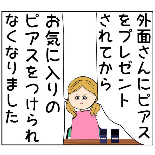 机に置かれた2つのピアスを前にふり子さんが話します。「外面さんにピアスをプレゼントされてからお気に入りのピアスをつけられなくなりました」