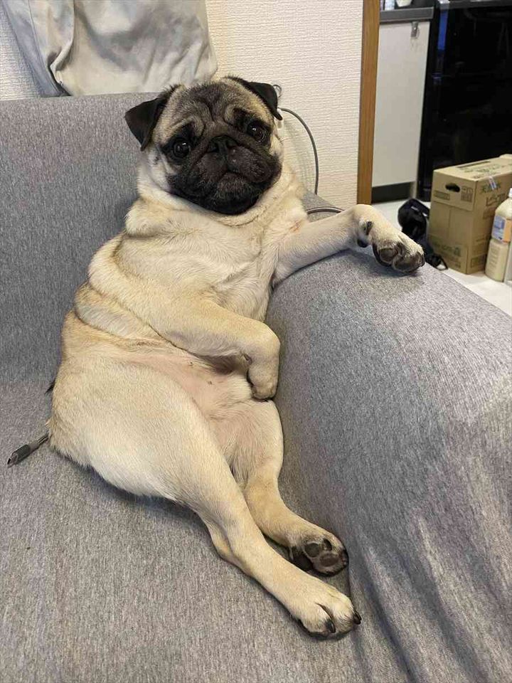 ソファでくつろぐパグ。その姿に反響「中に人が入っていませんか?」「たまらん!プリティーなお腹」